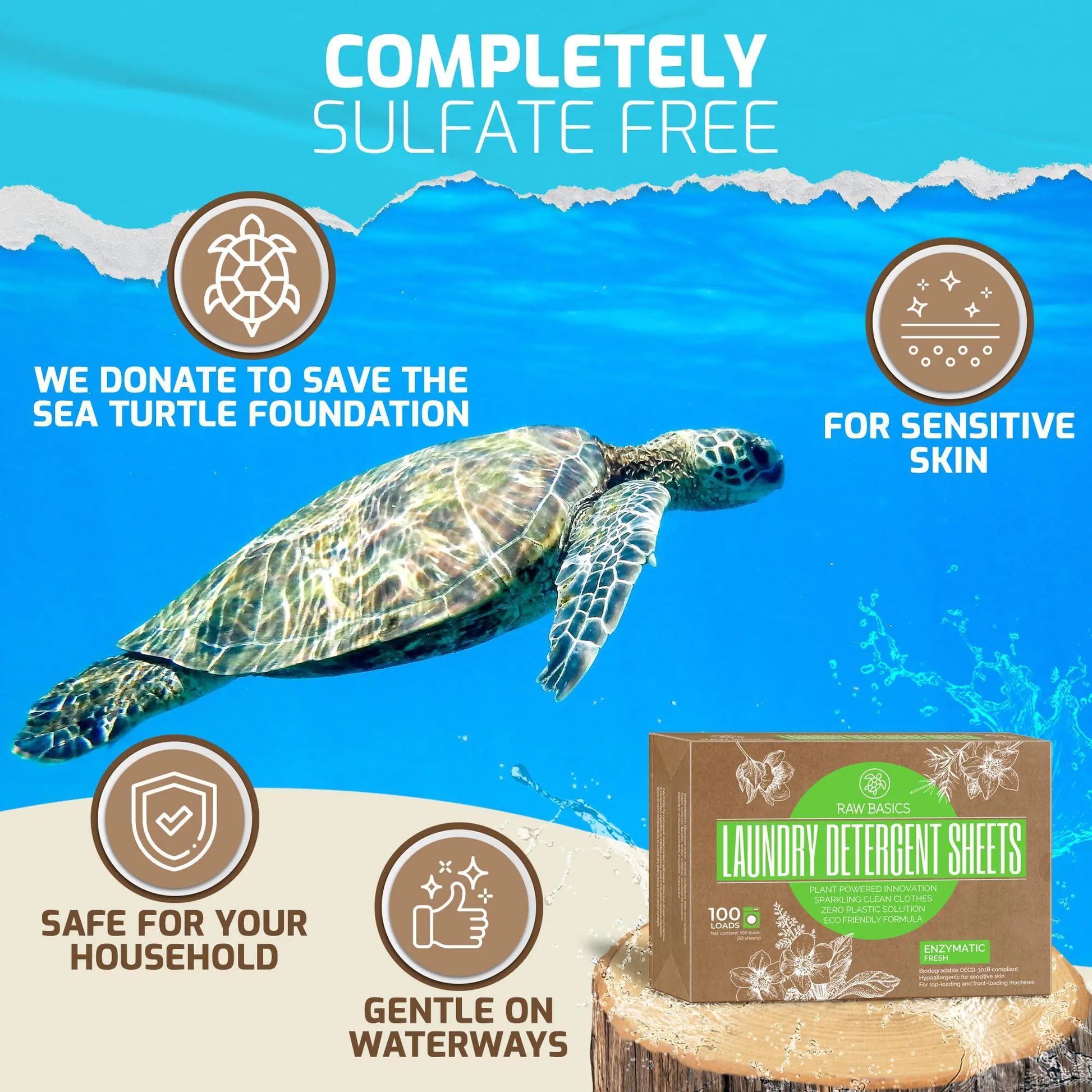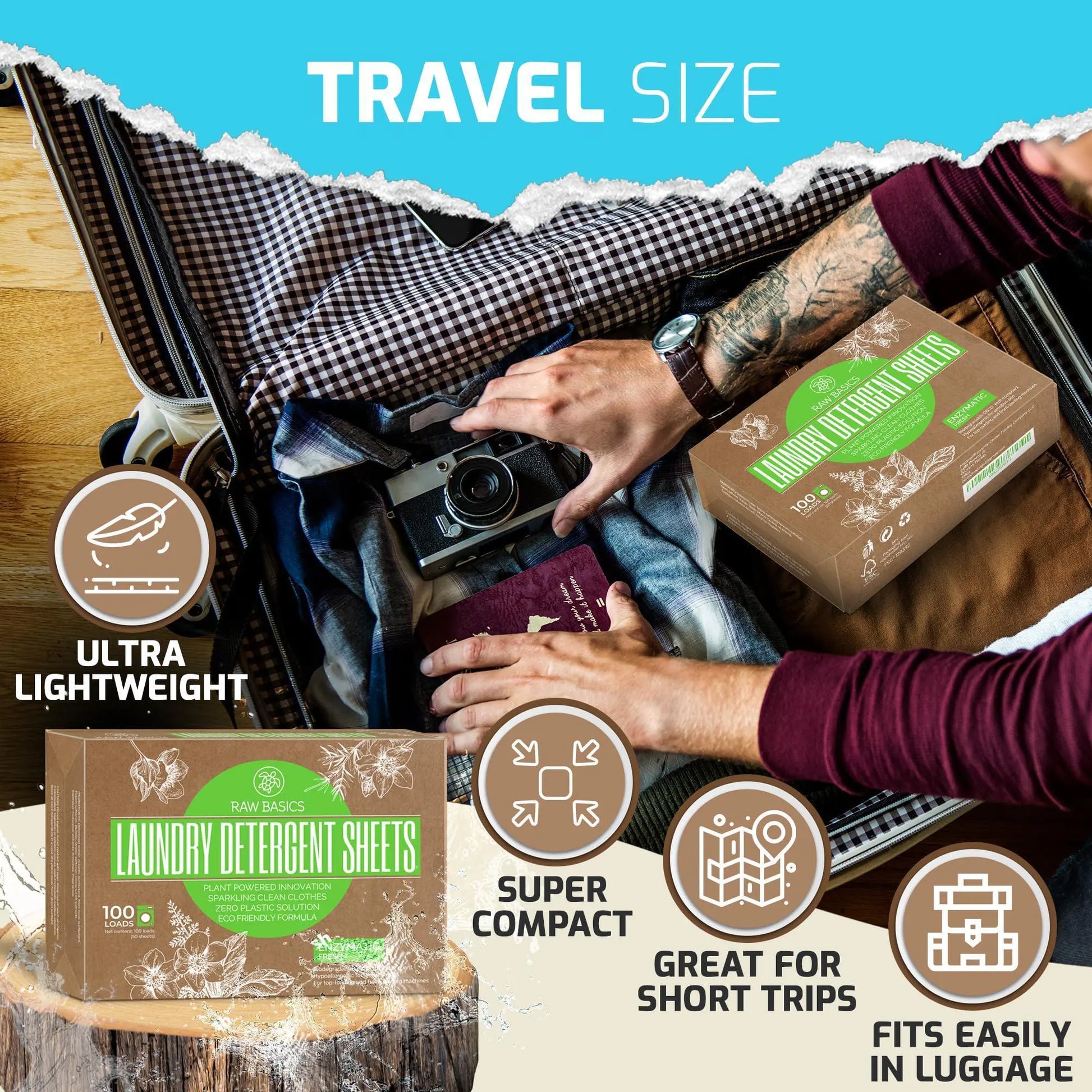 ZERO WASTE: Upgrade to plastic free laundry detergent with these clever laundry sheets from Raw Basics; Our laundry detergent sheets spell the end of single use plastics and come packaged in unbleached cardboard that rapidly breaks down at the end of its lifetime; For laundry supplies that tread lighter on the planet, trust only Raw Basics DEEP CLEAN: Our natural laundry detergent never compromises on quality and is unforgiving on stains; Raw Basics laundry sheets detergent use enzymatic technology to lift heavy stains and dirt that become ingrained in fabric fibers; Achieve dazzling whites and brighter colors with our advanced laundry soap sheets 100 LOADS: With 50 soap sheets per box, our laundry and travel detergent gives you up to 100 loads; For regular soiling, simply tear one of the washer sheets in half and save on laundry supplies; Stubborn stains and heavier dirt may require an entire sheet TRAVEL FRIENDLY: If youre in search of travel size laundry detergent, Raw Basics travel laundry sheets are the answer; These travel soap sheets are as light as a feather and wont weigh you down; Ideal for camping, short trips or even longer holidays, Raw Basics travel laundry detergent sheets are your new best friend on the road FRESH SCENT: Say goodbye to unscented laundry detergent that leaves your clothes with no perfume; These laundry detergent sheets contain a gentle fresh scent and are safe for people with sensitive skin; If youre in search of thats tough on dirt, Raw Basics laundry detergent sheets solution are the smarter choice